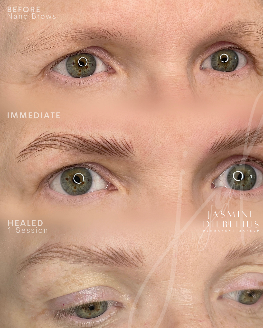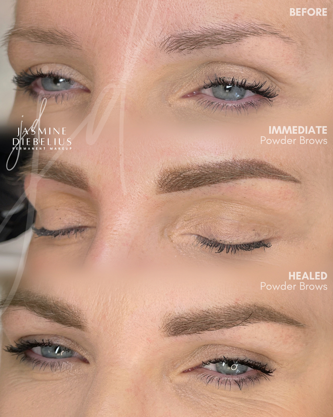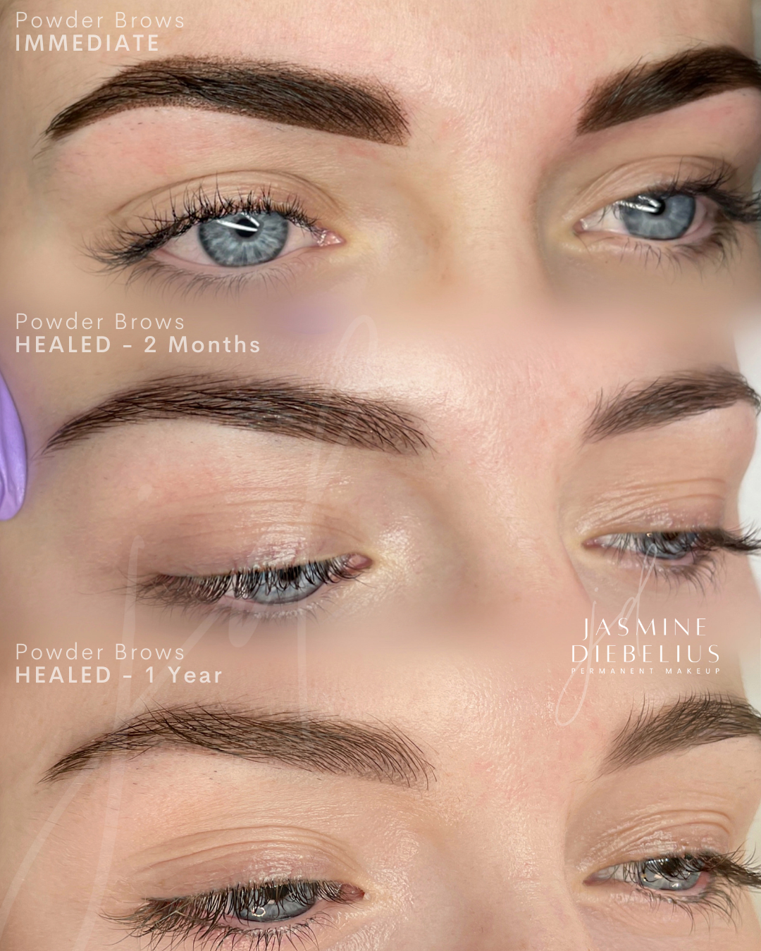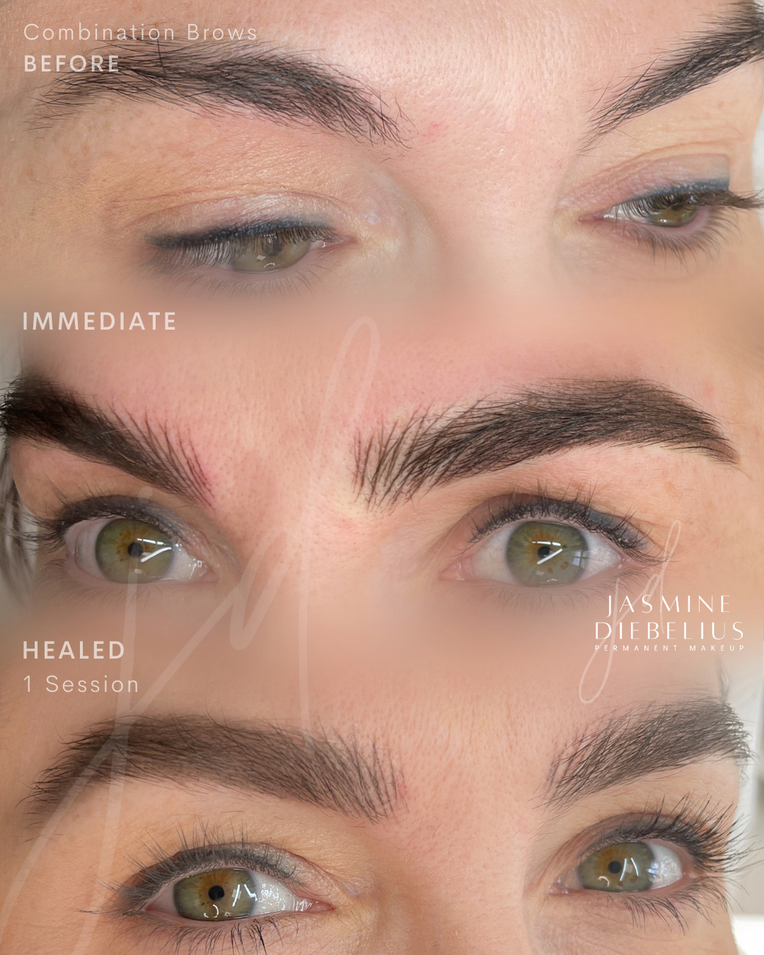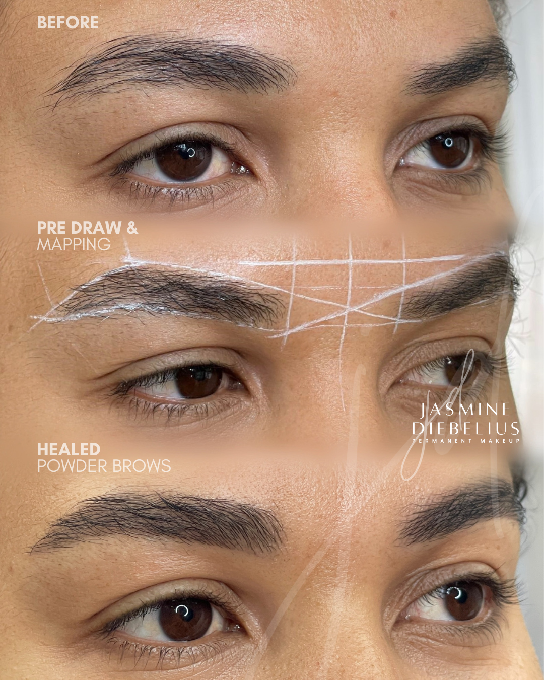 You will have a consultation before we start your treatment to discuss expectations, realistic goals, colour and shapes. A eyebrow template/pre draw is drawn in makeup for review and once you and Jasmine are both happy, the chosen pigment shade is infused using a tiny needle into the dermal layer of skin.